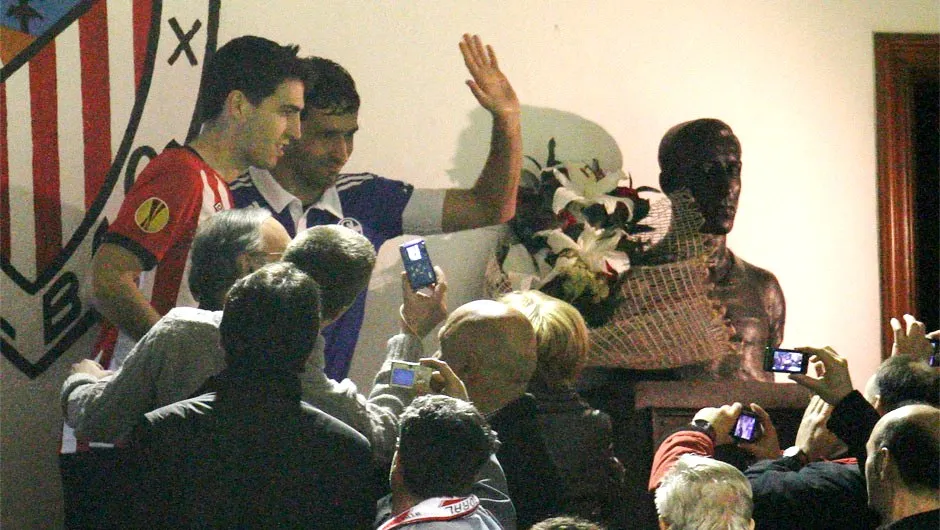 Ο Ραούλ συνοδευόμενος από τον αρχηγό της Αθλέτικ, Ιραόλα, καταθέτει την παραδοσιακή ανθοδέσμη στην προτομή του Πιτσίτσι.