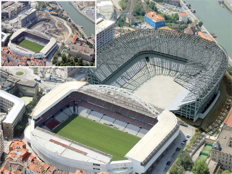 Όπως μπορείτε να δείτε και στη φωτογραφία, τα δυο γήπεδα είναι κυριολεκτικά κολλημένα το ένα στο άλλο και αυτός είναι ο λόγος για τον οποίο, την επόμενη περίοδο, όταν η Μπιλμπάο θα αγωνίζεται πλέον στο καινούργιο, δεν θα υπάρχει ακόμα το ένα από τα δυο πέταλα. Αυτό θα κατασκευαστεί στο σημείο που τώρα βρίσκεται η κεντρική κερκίδα του «Σαν Μαμές», όταν θα κατεδαφιστεί το παλιό γήπεδο και αναμένεται να είναι έτοιμο μέχρι το 2015. Το τόξο, το σήμα κατατεθέν του «Σαν Μαμές», δεν είναι γνωστό ακόμα πού θα χρησιμοποιηθεί. Μια από τις προτάσεις, την οποία έχουν αποδεχτεί τόσο ο σύλλογος, όσο και ο δήμος του Μπιλμπάο, είναι να τοποθετηθεί πάνω σε μια από τις γέφυρες στα κανάλια του ποταμού Νερβιόν.