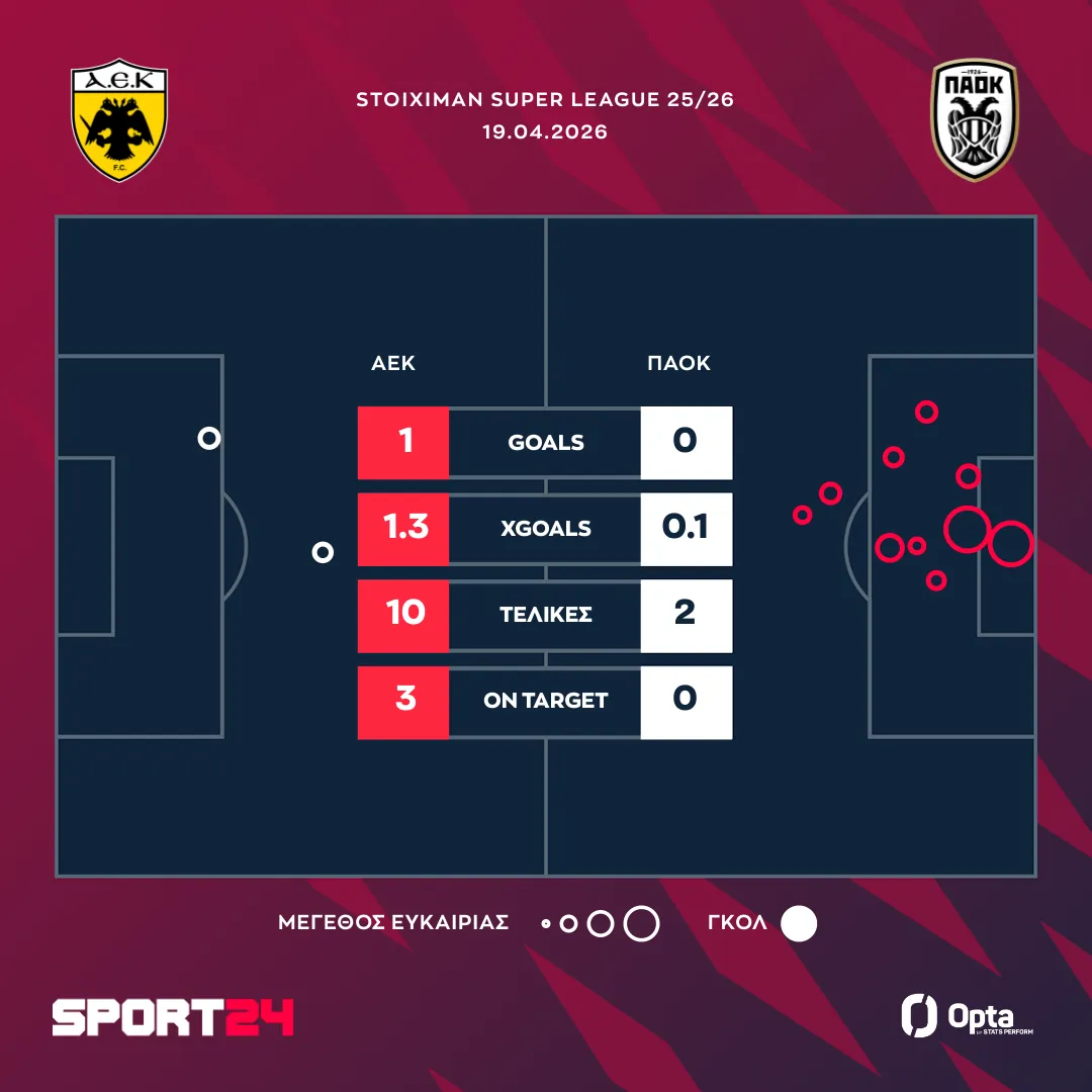 Στον αντίποδα ο ΠΑΟΚ είχε μόλις δύο τελικές (καμία στο στόχο) με αυτή του Χατσίδη από τις παρυφές της περιοχής να περνάει εκτός. Στο μοναδικό πράγμα που οι φιλοξενούμενοι βγήκαν κερδισμένοι στο πρώτο μέρος ήταν οι μονομαχίες στο χορτάρι και τον αέρα. Ιδού η εικόνα σε τελικές και xGoals από την Opta Stats / Perform.