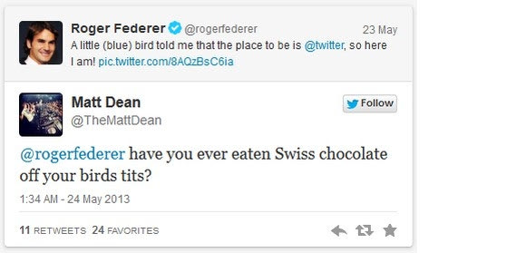 Ένα τρολ πάντως φρόντισε άμεσα να τον καλωσορίσει στον κόσμο του ίντερνετ. Μια από τις αποκρίσεις στο πρώτο tweet του Ρότζερ ήταν… λίγο αδιάκριτη και αμέσως έγινε θέμα στο deadspin.com.