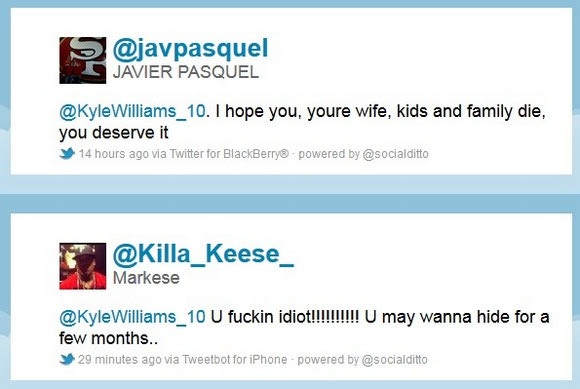 Αντίθετα ο Κάιλ Γουίλιαμς ( @KyleWilliams_10) δεν πτοήθηκε από τις απειλές μετά από μια ήττα τον Ιανουάριο. “Ελπίζω εσύ, η γυναίκα σου, τα παιδιά σου, όλη η οικογένειά σου να πεθάνει. Το αξίζεις”, ήταν ένα από τα tweets που του εστάλη.