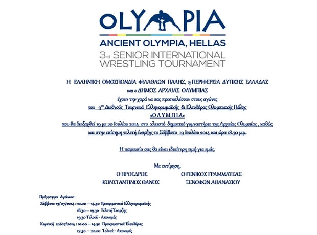 Στην κοιτίδα του Ολυμπισμού θα βρεθούν Ολυμπιονίκες, πρωταθλητές κόσμου και Ευρώπης με στόχο να αγωνιστούν στα χώματα όπου διεξάγονταν οι αρχαίοι Ολυμπιακοί Αγώνες. Το διεθνές τουρνουά «Ολυμπία» έχει γίνει θεσμός και καθημερινά φτάνουν στα γραφεία της Ελληνικής Ομοσπονδίας Φιλάθλων Πάλης και νέες συμμετοχές. Στην ιστορική πόλη της Ηλείας θα αγωνιστούν αθλητές και αθλήτριες από, τουλάχιστον, 20 χώρες.