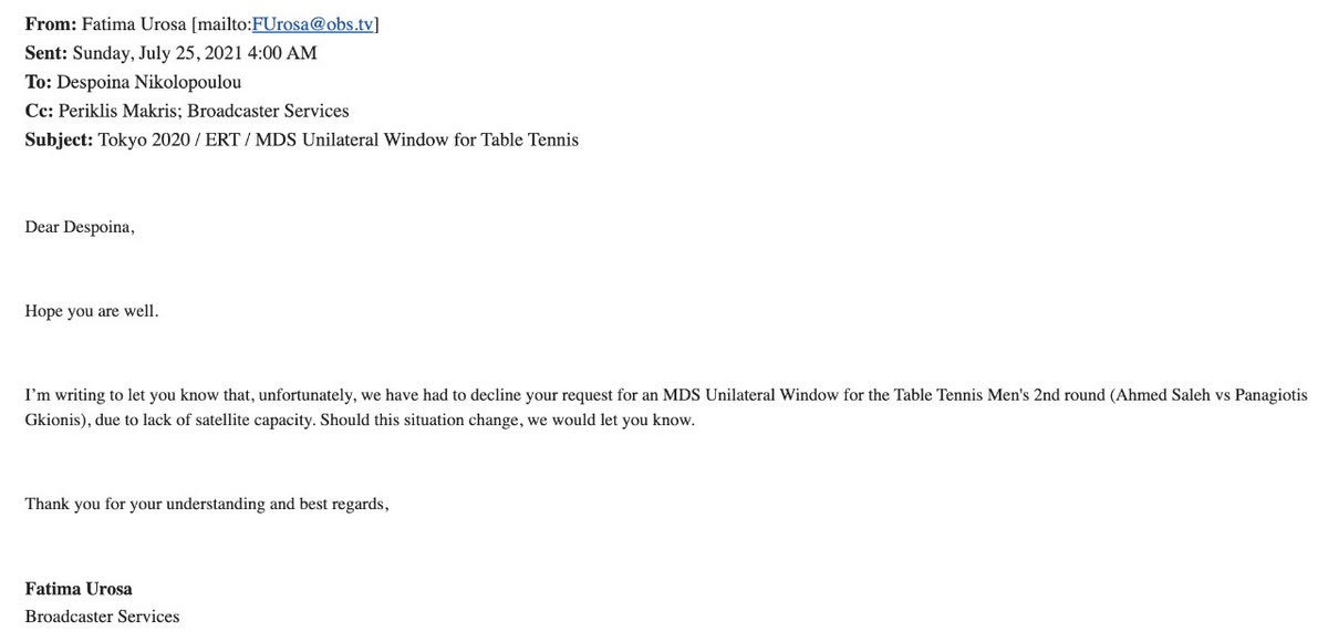 “Η ΕΡΤ, όπως όλα τα εθνικά δίκτυα που καλύπτουν τους Ολυμπιακούς Αγώνες, καταβάλλει κάθε δυνατή προσπάθεια για να μεταδώσει ζωντανά όλες -ει δυνατόν- τις προκριματικές προσπάθειες των αθλητών της χώρας μας. Έτσι συνέβη και με τον πρωταθλητή μας στο Πινγκ Πονγκ Παναγιώτη Γκιώνη, που αγωνίστηκε σε δεύτερο προκριματικό αγώνα σήμερα το πρωί. Αμέσως μόλις έγινε γνωστό πότε αγωνίζεται -μετά την πρώτη πρόκρισή του που η ΕΡΤ μετέδωσε live- υπήρξε γραπτό αίτημα της ΕΡΤ προς την καθ’ ύλην αρμόδια εταιρεία παραγωγής Olympics Broadcasting Services (ΟΒS), με την οποία έχει συμβληθεί η Δημόσια Τηλεόραση, για να μεταδοθεί και ο δεύτερος αγώνας του. Ωστόσο, όπως φαίνεται και από την επισυναπτόμενη αλληλογραφία, αυτό απερρίφθη χθες βράδυ ελλείψει διαθέσιμων δορυφορικών πόρων.