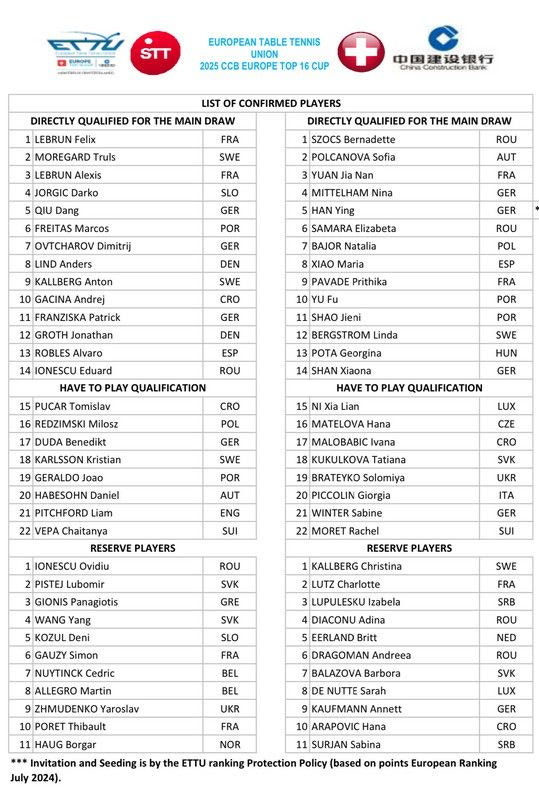 Στην παρακάτω φωτογραφία βλέπετε την επιβεβαιωμένη λίστα των αθλητών και των αθλητριών. Χωρίζεται στους 14, που περνάνε απευθείας στο κυρίως ταμπλό, στους 8, οι οποίοι πρέπει ν’ αγωνιστούν στα προκριματικά και στους 11 αναπληρωματικούς.