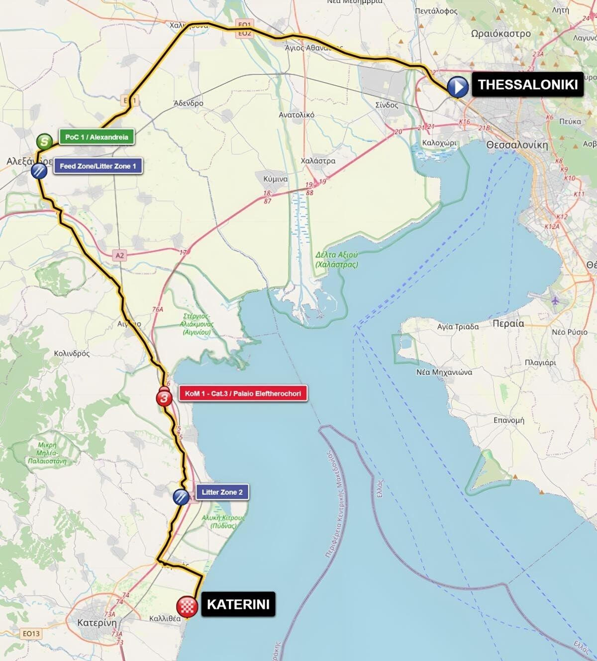 Το πελοτόν θα πραγματοποιήσει ένα αριστερόστροφο ημικύκλιο, για να βγει από τον Νομό Θεσσαλονίκης, να περάσει για λίγο από τον Νομό Ημαθίας όπου είναι τοποθετημένο το ενδιάμεσο σπριντ ευθείας (Αλεξάνδρεια, χλμ 42) και να εισέλθει στον Νομό Πιερίας.