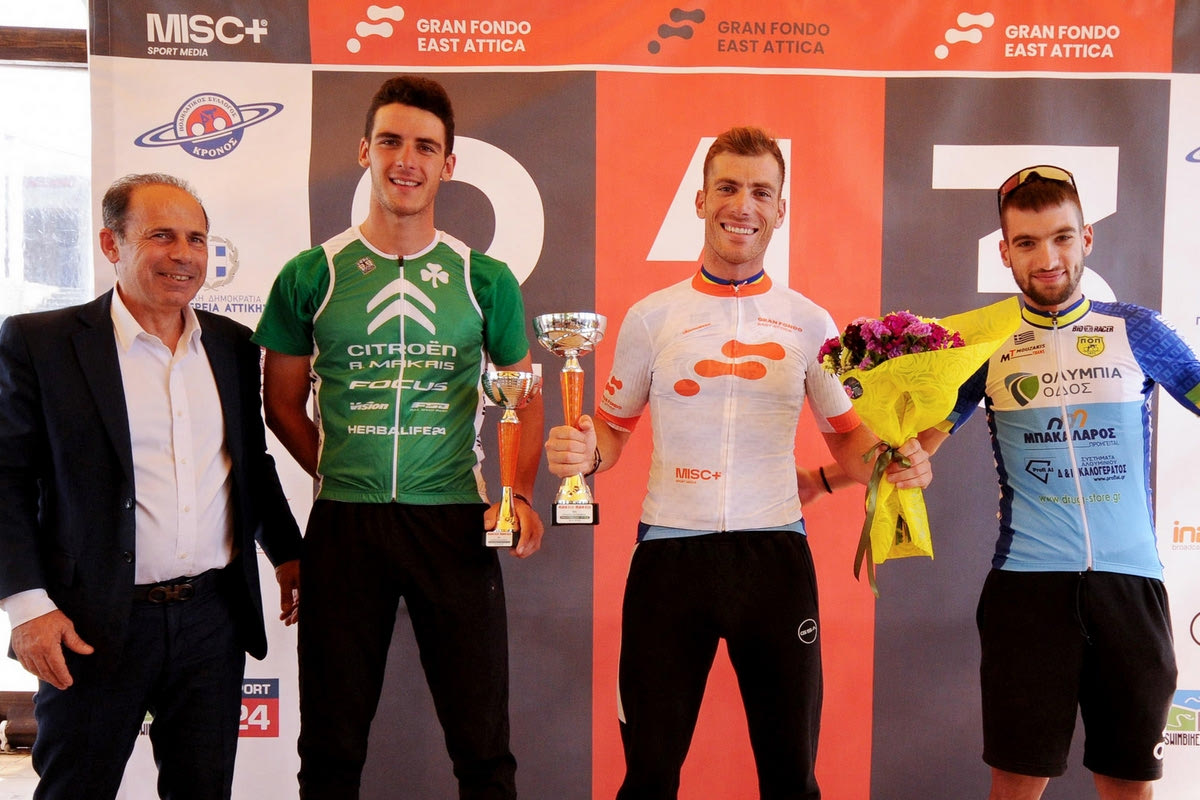 Στην πρώτη ανηφόρα το πελοτόν χωρίστηκε και απέμειναν οχτώ ποδηλάτες, και στη συνέχεια πέντε για να δίνουν το ρυθμό. Στη δεύτερη μεγάλη ανηφόρα, το γκρουπ “έσπασε” ξανά, για να απομείνουν τέσσερις καθ’ οδόν για το τελικό σπριντ: οι Νίκος Βουκελάτος, Μαρτίνος Μούτσιος, Πέτρος Γκαζώνης και Διονύσης Δούζας. Ο παλιός πρωταθλητής Ελλάδας Νίκος Βουκελάτος μπήκε πρώτος στην τελική ευθεία και με πολλές δυνάμεις αναδείχτηκε νικητής στο Gran Fondo East Attica.