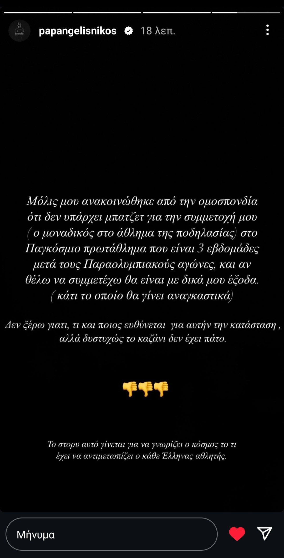 “Μόλις μου ανακοινώθηκε από την ομοσπονδία ότι δεν υπάρχει μπάτζετ για τη συμμετοχή μου (ο μοναδικός στο άθλημα της ποδηλασίας) στο Παγκόσμιο πρωτάθλημα που είναι 3 εβδομάδες μετά από τους Παραολυμπιακούς Αγώνες και αν θέλω να συμμετάσχω θα είναι με δικά μου έξοδα (κάτι που θα γίνει αναγκαστικά).