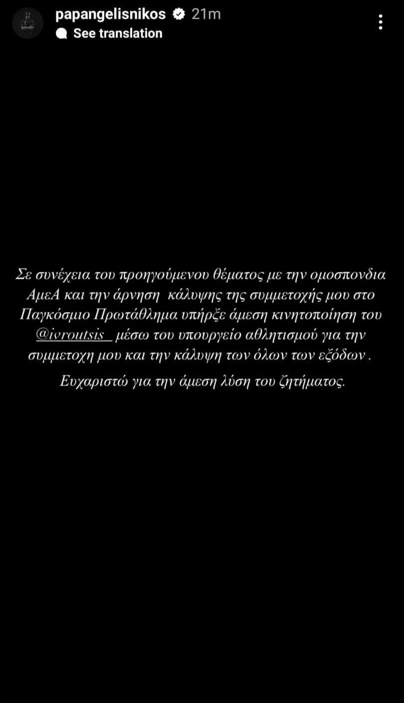 Λίγη ώρα αργότερα, το εν λόγω ζήτημα υπέπεσε στην αντίληψη του αναπληρωτή Υπουργού Αθλητισμού, Γιαννη Βρούτση, ο οποίος παρενέβη αμέσως για να διευθετήσει την υπόθεση. Για την ακρίβεια, ο κ. Βρούτσης θα καλύψει τα έξοδα μετάβασης του Έλληνα πρωταθλητή, ο οποίος επανήλθε με νέα ανάρτηση στο Instagram, σημειώνοντας: