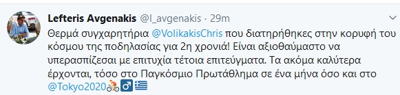 “Θερμά συγχαρητήρια, Χρήστο Βολικάκη, που διατηρήθηκες στην κορυφή του κόσμου της ποδηλασίας για 2η χρονιά! Είναι αξιοθαύμαστο να υπερασπίζεσαι με επιτυχία τέτοια επιτεύγματα. Τα ακόμα καλύτερα έρχονται, τόσο στο Παγκόσμιο Πρωτάθλημα σε ένα μήνα όσο και στο @Tokyo2020”, ανέφερε το μήνυμα του υφυπουργού αθλητισμού, Λευτέρη Αυγενάκη.