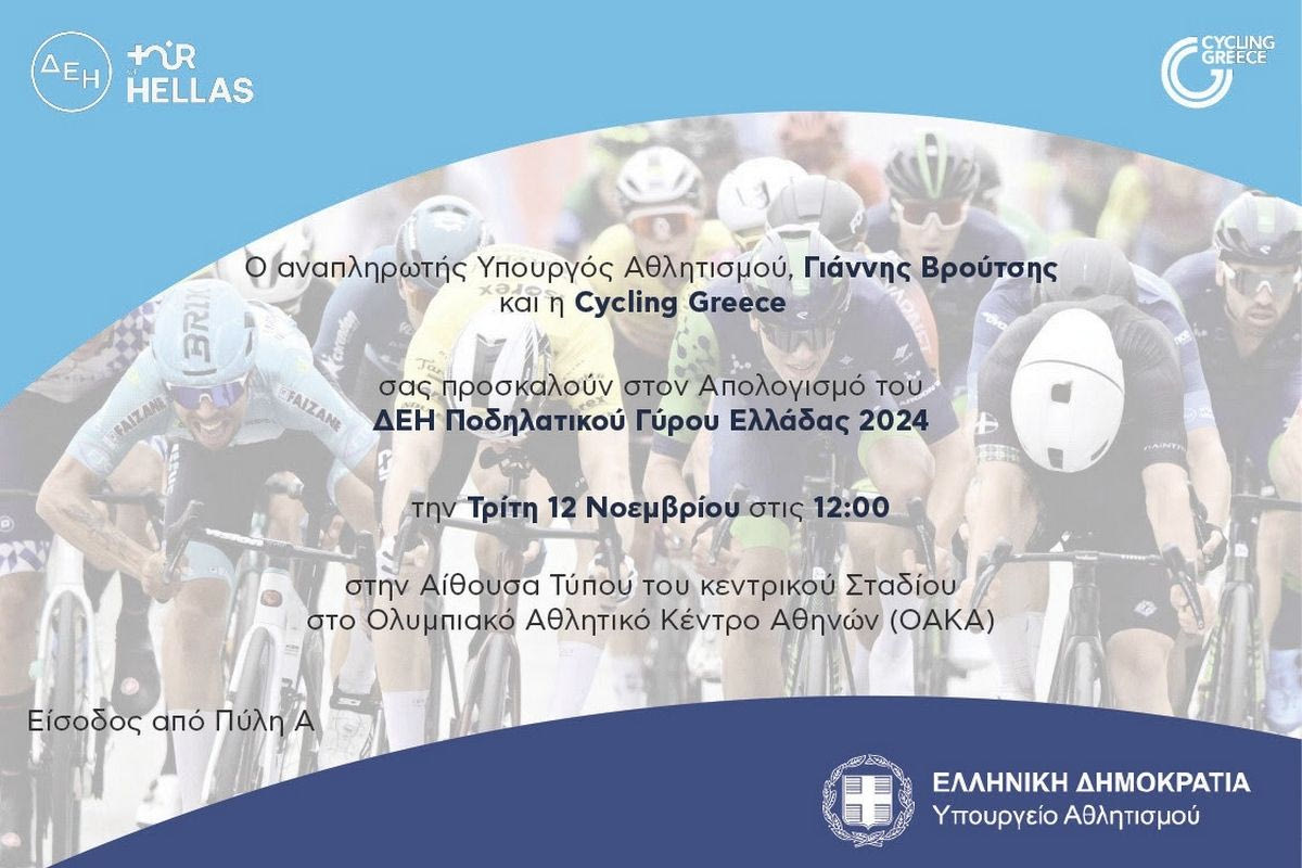 Ο αναπληρωτής Υπουργός Αθλητισμού, Γιάννης Βρούτσης και η Οργανωτική επιτροπή του ΔΕΗ Ποδηλατικού Γύρου Ελλάδας σας προσκαλούν στον Απολογισμό της διοργάνωσης του 2024.
