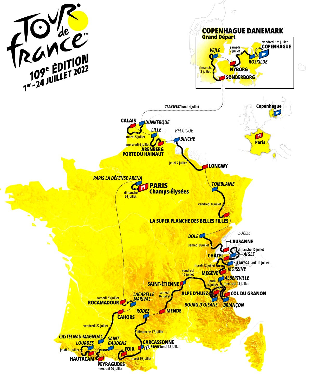 Το πέρασμα από τη Δανία θα ολοκληρωθεί με το 3ο ετάπ, επίσης επίπεδο, που και αυτό αναμένεται να καταλήξει σε μαζικό σπριντ. Αμέσως μετά, θα ακολουθήσει η πρώτη ημέρα ξεκούρασης, για να μεταφερθούν οι ομάδες στη Γαλλία και την Δουνκέρκη, από όπου θα εκκινήσει το 4ο ετάπ, μια ακόμη ευκαιρία για τους σπρίντερ, αν δεν δημιουργήσει προβλήματα ο αέρας στα τελευταία χλμ προς το Καλαί. Το 5ο ετάπ, από τη Λιλ στο Άρενμπεργκ, το μικρό Παρί-Ρουμπέ, με 19,4 χλμ παβέ, χωρισμένα σε 11 τμήματα (κάποια από τα οποία πολύ δύσκολα) στο δεύτερο μισό της διαδρομής, θα είναι ένα σημαντικό τεστ για τους διεκδικητές της κίτρινης φανέλας.