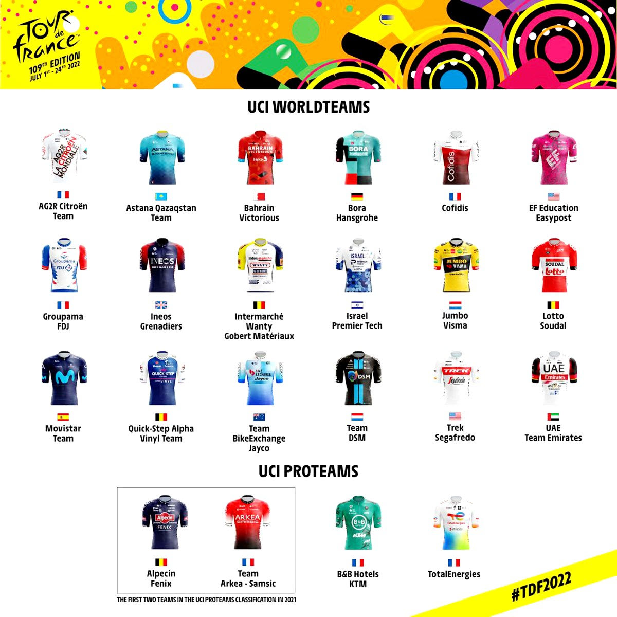 Η οργανωτική επιτροπή του Γύρου της Γαλλίας έχει προσκαλέσει 22 ομάδες για να συμμετάσχουν στον φετινό αγώνα. Θα είναι παρούσες οι 18 επαγγελματικές ομάδες της πρώτης κατηγορίας (UCI World Teams), καθώς και οι δυο κορυφαίες UCI Pro Teams της περασμένης σεζόν, δηλαδή η Alpecin Fenix και η Arkéa Samsic. Την 22άδα συμπληρώνουν δυο ακόμα UCI Pro Teams, που πήραν wild cards από τη διοργάνωση, η B&B Hotels-KTM και η TotalEnergies. Η κάθε ομάδα αποτελείται από 8 αθλητές, άρα στην εκκίνηση του αγώνα θα βρεθούν 176 ποδηλάτες. Τη μερίδα του λέοντος στις συμμετοχές έχει η Γαλλία με έξι ομάδες, ακολουθεί το Βέλγιο με τέσσερις και αμέσως μετά, οι ΗΠΑ και η Γερμανία με δυο ομάδες η καθεμία. Τέλος, το Καζακστάν, η Ολλανδία, η Αυστραλία, η Μεγάλη Βρετανία, η Ισπανία, το Ισραήλ, το Μπαχρέιν και τα Ηνωμένα Αραβικά Εμιράτα έχουν μονή εκπροσώπηση. Αναλυτικά οι 22 ομάδες: