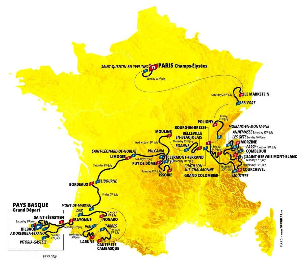 Όπως βλέπουμε στον χάρτη της διαδρομής, από τον φετινό σχεδιασμό απουσιάζουν τελείως η νότια και η βόρεια Γαλλία, καθώς και τα δυτικά παράλια. Ολόκληρος ο αγώνας θα διεξαχθεί ουσιαστικά στον κεντρικό “άξονα” της χώρας, ξεκινώντας από τα νοτιοδυτικά (Χώρα των Βάσκων και Πυρηναία) και διατηρώντας συνεχώς από εκεί και μετά πορεία προς τα ανατολικά, μέσω του Μασίφ Σεντράλ, με τελικό προορισμό τον Ιούρα, τις Άλπεις και τα Βόσγια, πριν την “παρέλαση” στο Παρίσι και τα Ηλύσια Πεδία.