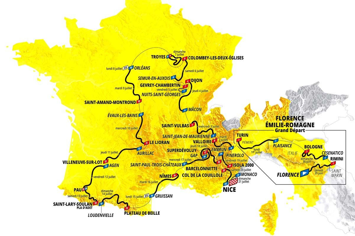 Η Ιταλία θα φιλοξενήσει για πρώτη φορά το “Grand Départ” του Γύρου Γαλλίας, με το 1ο ετάπ που θα ξεκινήσει από τη Φλωρεντία και αφού περάσει πρώτα από 7 βαθμολογούμενες ανηφόρες (3.600 υψομετρικά) και στη συνέχεια από το Σαν Μαρίνο, θα τερματίσει στο Ρίμινι. Πιο δύσκολο από το αντίστοιχο περσινό ετάπ στο Μπιλμπάο, όπου πρωταγωνίστησαν τα φαβορί. Το 2ο ετάπ είναι πιο εύκολο, αλλά στα τελευταία 35 χλμ, οι αθλητές θα ανέβουν δυο φορές στον λόφο του Σαν Λούκα στην Μπολόνια (1.9 χλμ στο 10.6%), πριν τερματίσουν στην πρωτεύουσα της Εμίλια Ρομάνια. Το 3ο ετάπ, το μεγαλύτερο της φετινής διοργάνωσης (231 χλμ) είναι αφιερωμένο στον “Campionissimo” Φάουστο Κόπι (το πελοτόν θα περάσει από την Τορτόνα, εκεί όπου πέθανε το 1960 ο μεγάλος Ιταλός ποδηλάτης) και ο τερματισμός στο Τορίνο προορίζεται για τους σπρίντερ.