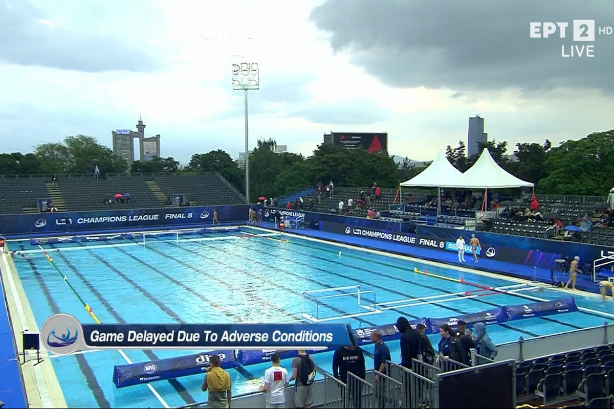 Ωστόσο, λόγω της έντονης βροχής που μετατράπηκε σε καταιγίδα, οι διαιτητές ζήτησαν από τους παίκτες των δύο ομάδων να βγουν από την πισίνα και διέταξαν την προσωρινή διακοπή του αγώνα, θέτοντας ζήτημα για τη σωματική ακεραιότητά τους λόγω των κεραυνών που πέφτουν.