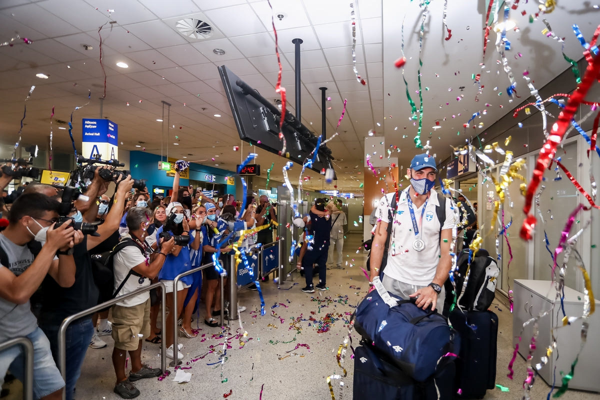 Οι ασημένιοι Ολυμπιονίκες είδαν τους δικούς τους ανθρώπους που τους υποδέχθηκαν (συγγενείς, φίλοι αλλά και οι σύντροφοί τους) να τους αποθεώνουν, ενώ μεταξύ άλλων υπήρχαν ακόμα και κομφετί και βουβουζέλες. Στο αεροδρόμιο βρέθηκαν μεταξύ άλλων και ο Υφυπουργός Αθλητισμού Λευτέρης Αυγενάκης, αλλά και ο Γ.Γ.Α Γιώργο Μαυρωτά.