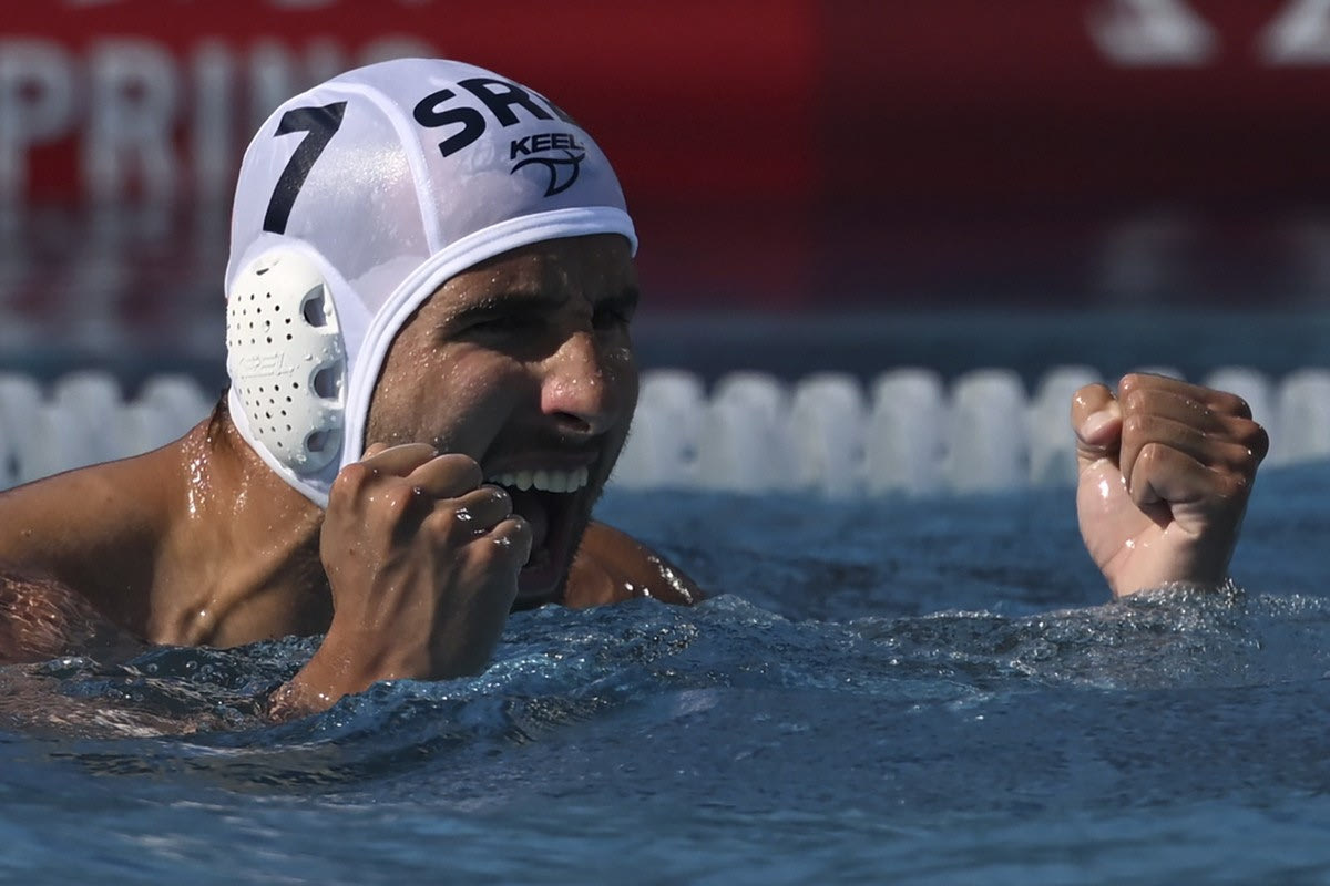 Strahinja Rasovic of Serbia reacts during the Men's water polo quarterfinal match between Serbia and Croatia at the 19th FINA World Championships in Budapest, Hungary, Wednesday, June 29, 2022. (AP Photo/Anna Szilagyi)