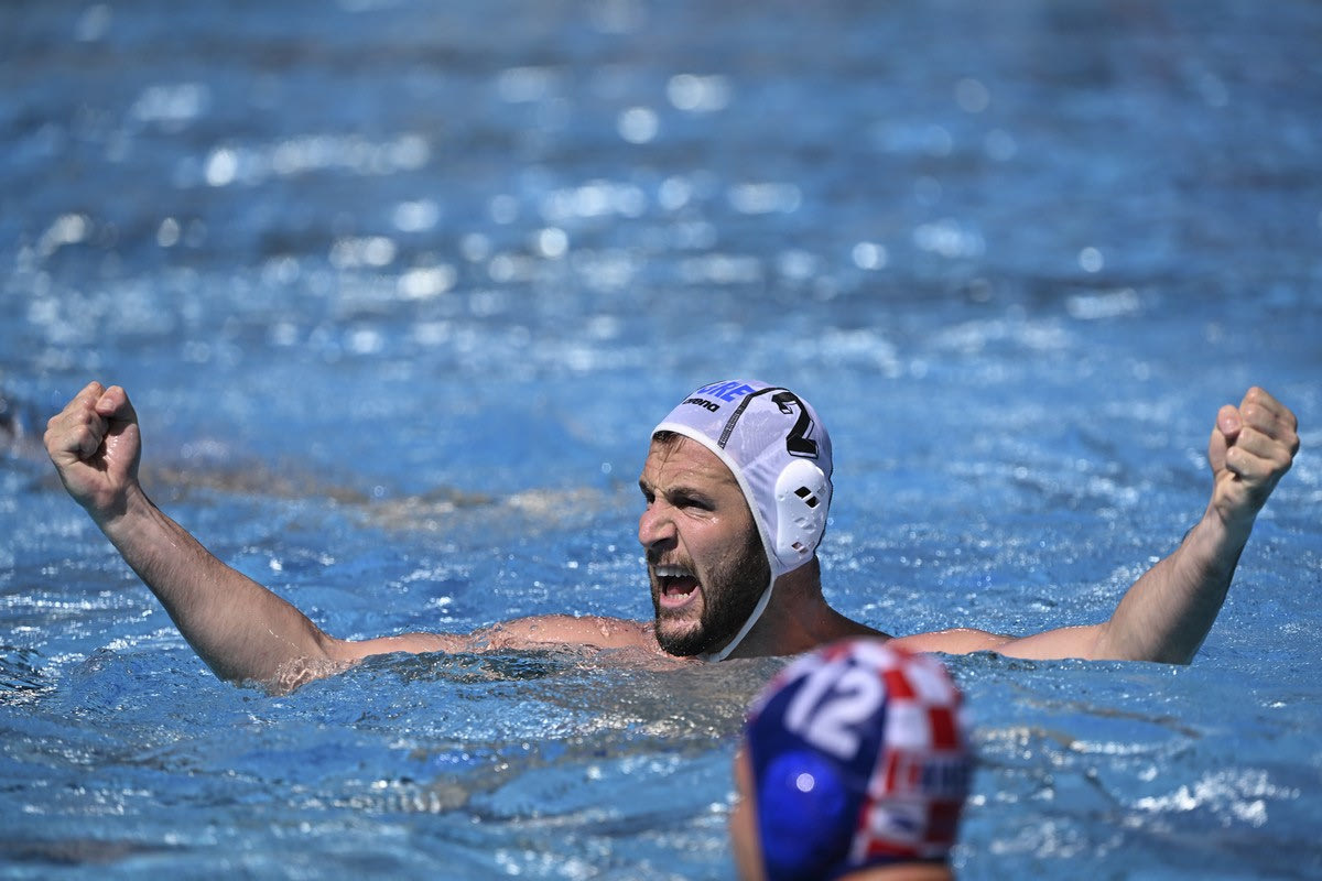 Konstantinos Genidounias of Greece reacts during the Men's water polo bronze medal match between Greece and Croatia at the 19th FINA World Championships in Budapest, Hungary, Sunday, July 3, 2022. (AP Photo/Anna Szilagyi)