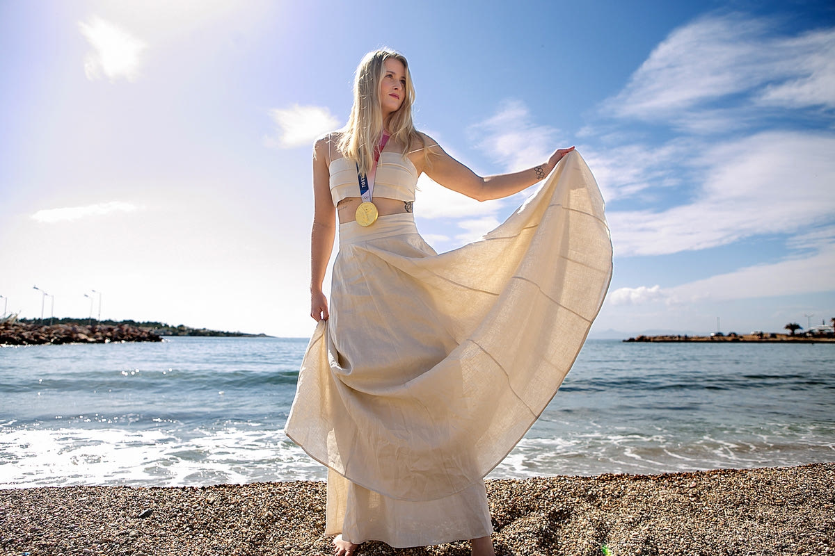 Φόρεσε τα λευκά ρούχα της, το χρυσό Ολυμπιακό μετάλλιο που κατέκτησε στο Τόκιο και στάθηκε στην ακροθαλασσιά. Διέκοπτε για να μαζέψει από την άμμο πεταμένα μπουκάλια. Η ανακύκλωση προέχει της συνέντευξης. Η πρώτη Ελληνίδα που αγωνίστηκε σε ομαδικό σπορ με τις ΗΠΑ στους Ολυμπιακούς Αγώνες και η μοναδική που κατέκτησε μετάλλιο, Στεφανία Χαραλαμπίδη μαγεύεται από την ελληνική θάλασσα και λέει δυνατά ότι επιβάλλεται να είναι καθαρή.