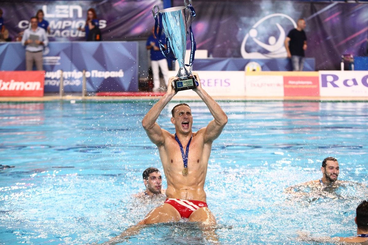 Οι πολίστες του Ολυμπιακού πανηγυρίζουν την κατάκτηση του πρωταθλήματος μετά από νίκη επί της Βουλιαγμένης