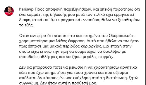 “Προς αποφυγή παρεξηγήσεων και επειδή παρατηρώ ότι ένα κομμάτι της δήλωσής μου μετά τον τελικό έχει ερμηνευτεί διαφορετικά απ’ ό,τι πραγματικά εννοούσα, θέλω να ξεκαθαρίσω το εξής: Όταν ανέφερα ότι “έσπασε το κατεστημένο του Ολυμπιακού”, χρησιμοποίησα μια λάθος έκφραση.
