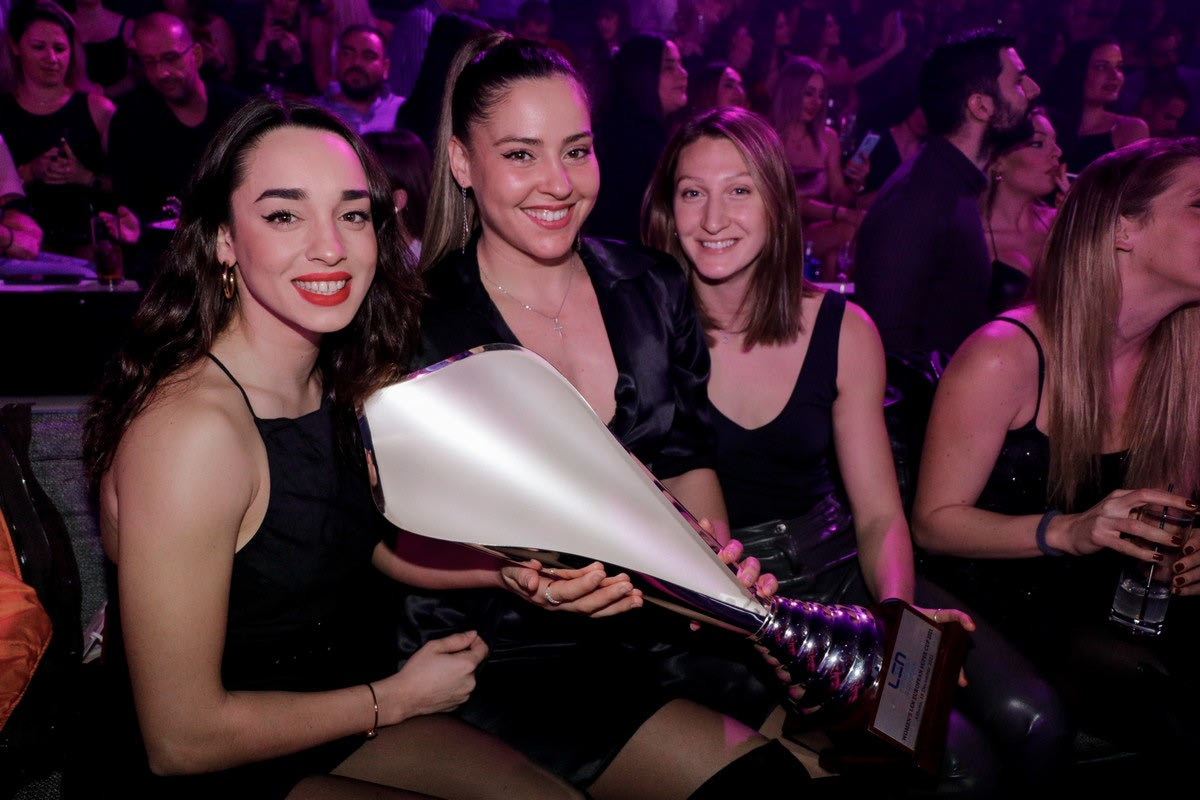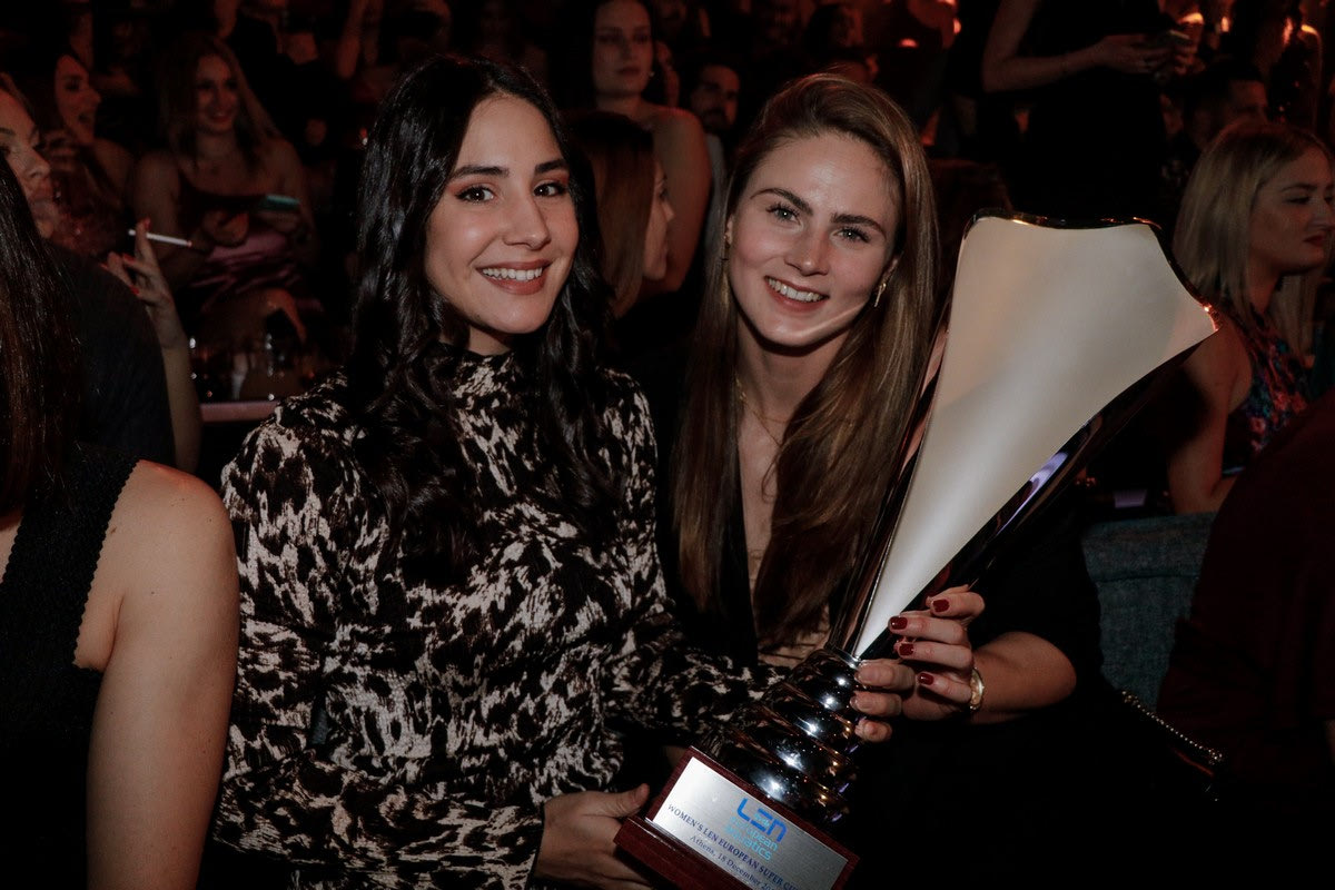 Χαμογελαστές, ευδιάθετες και με το τρόπαιο σταθερά σε πρώτο πλάνο οι παίκτριες της γυναικείας ομάδας πόλο του Ολυμπιακού γιόρτασαν σε νυχτερινό κέντρο την κατάκτηση του ευρωπαϊκού Super Cup.