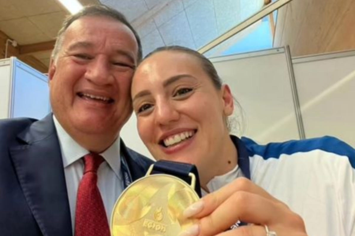 Η σπουδαία Ελληνίδα σκοπεύτρια κατάφερε το μεσημέρι της Δευτέρας (26/06) να κατακτήσει το χρυσό μετάλλιο, με τον Πρόεδρο της ΕΟΕ, Σπύρο Καπράλο, να κάνει την απονομή.