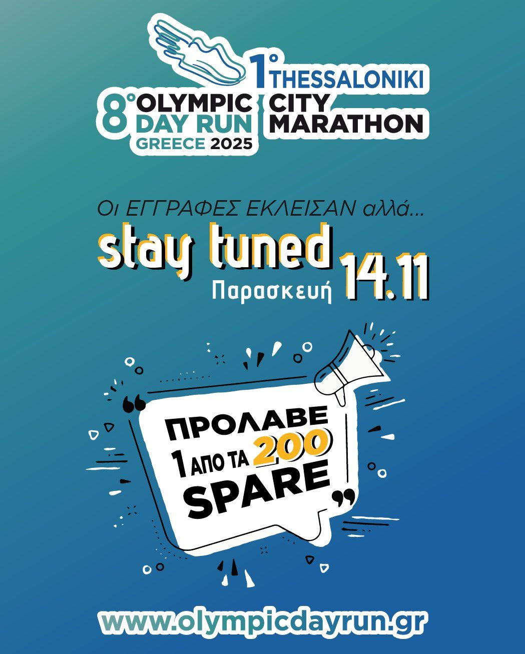 Αν δεν πρόλαβες να κάνεις την εγγραφή σου, συντονίσου την Παρασκευή 14.11 στο olympicdayrun.gr και εξασφάλισε μία από τις τελευταίες θέσεις.