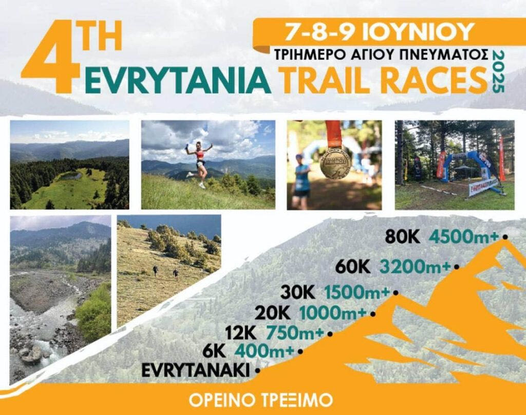 Το τριήμερο του Αγίου Πνεύματος, στις 7-8-9 Ιουνίου 2025, ο Σύλλογος “Ε4-ΤΟ ΠΑΝΤΑ ΒΡΕΧΕΙ” διοργανώνει στην Ευρυτανία το 4ο Evrytania Trail Races, με έξι υπέροχους αγώνες ορεινού τρεξίματος.