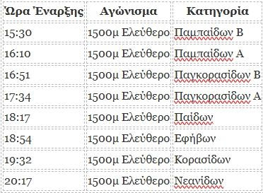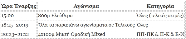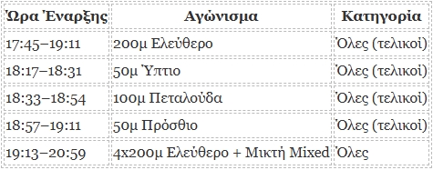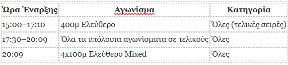 Οι μεσημβρινές/απογευματινές/βραδινές ενότητες (Β2–Β3, Γ2–Γ3, Δ2–Δ3) ξεκινούν μεταξύ 15:00–18:15 και περιλαμβάνουν τελικούς 50–200 μ., τελικές σειρές αγωνισμάτων 400–1.500 μ.