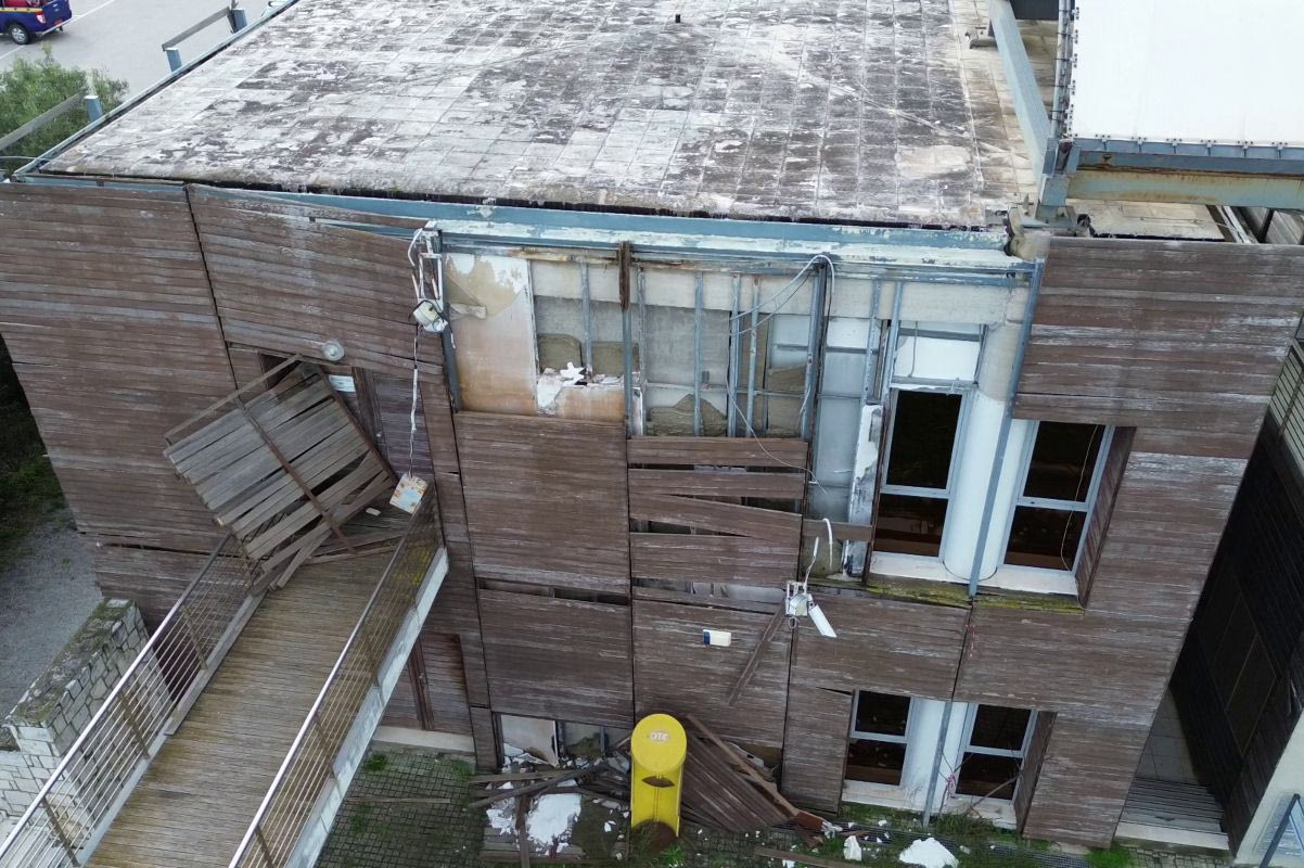Ιδια τραγική κατάσταση και στα κτίρια της εγκατάστασης. Σπασμένα ξύλα, ξεχαρβαλωμένα παράθυρα, ηλεκτρικές και υδραυλικές εγκαταστάσεις διαλυμένες. Στο εσωτερικό είχαν αποκολληθεί σοβάδες και ψευδοροφές μετά τις κακοκαιρίες, κρέμονταν καλώδια, η υγρασία ήταν διάχυτη σε όλες τις αίθουσες.