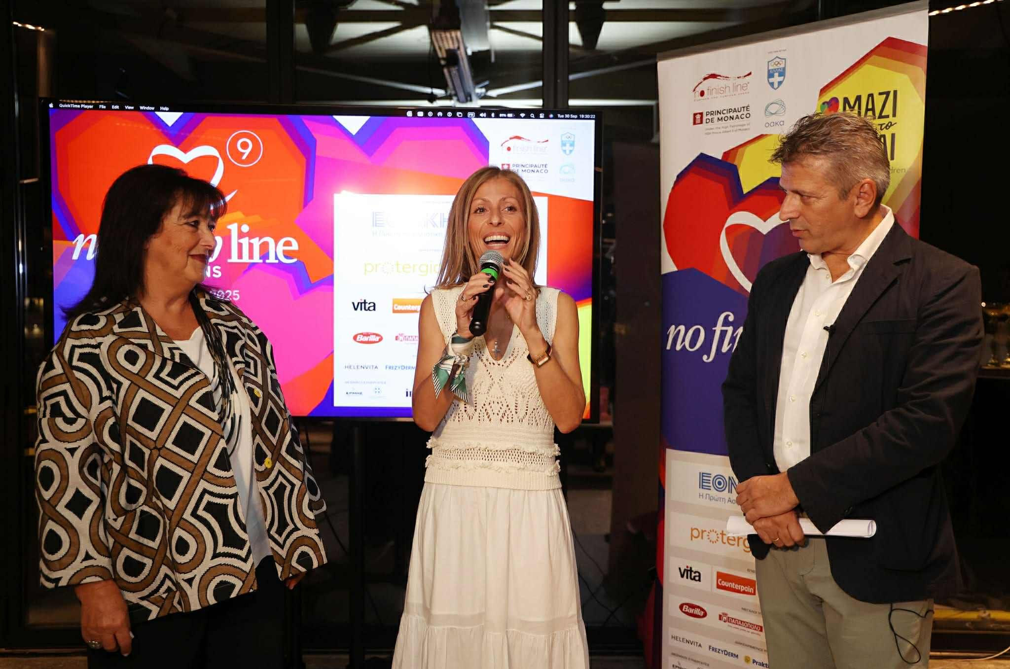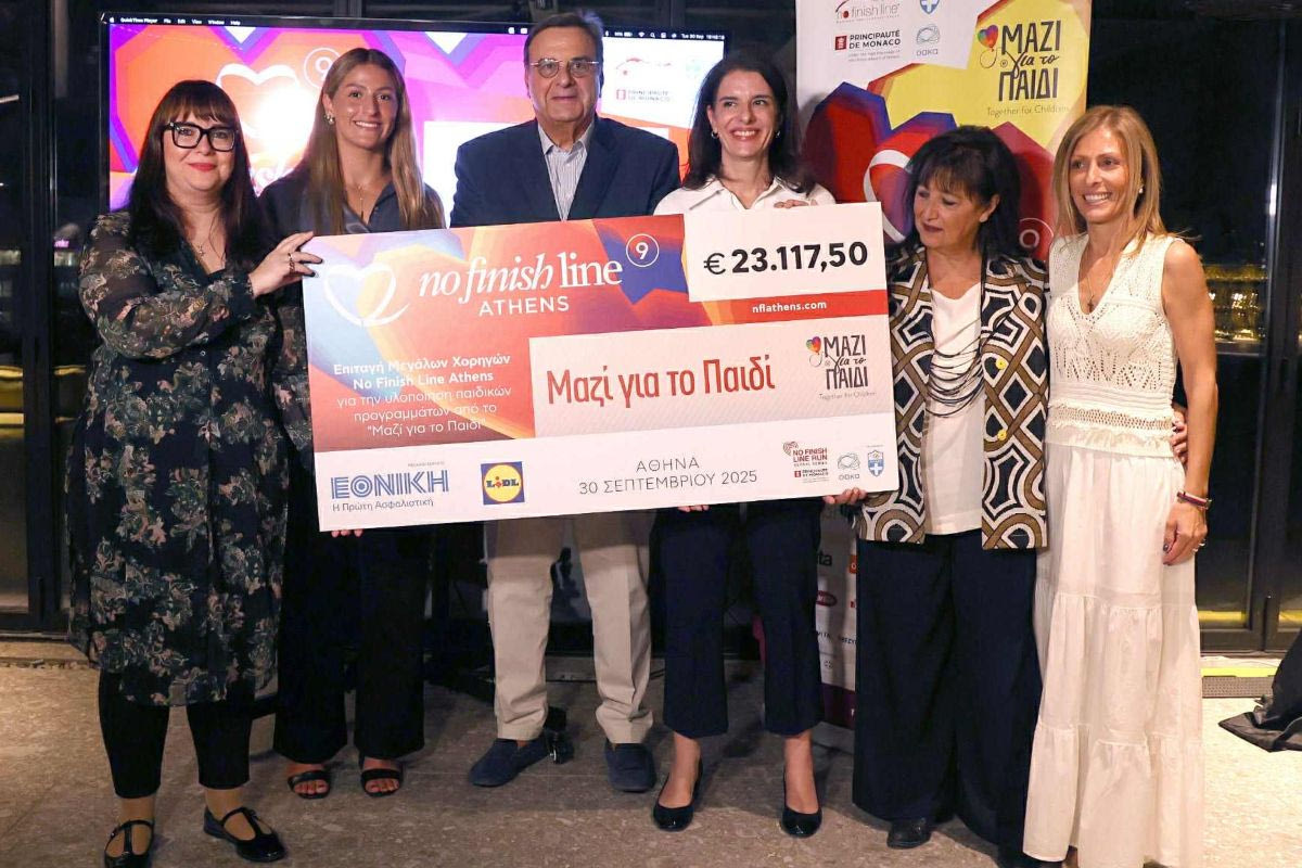 Στην εκδήλωση που έλαβε χώρα την Τρίτη 30 Σεπτεμβρίου 2025 στο Moxy Athens City, η πρόεδρος και εκτελεστική διευθύντρια του No Finish Line Athens, κ. Σοφία Κέδε μαζί με εκπροσώπους από τους δύο μεγάλους χορηγούς της διοργάνωσης την γενική διευθύντρια μάρκετινγκ και επικοινωνίας της Εθνικής Ασφαλιστικής, κ. Ειρήνη Χαλκιαδάκη, την Υπεύθυνη Εταιρικής Υπευθυνότητας της Lidl Ελλάς κ. Μαρία Ρουκούδη, παρέδωσαν την επιταγή δωρεάς στην κ. Γιάννα Παναγιωτίδου, μέλος του ΔΣ του «Μαζί για το Παιδί».
