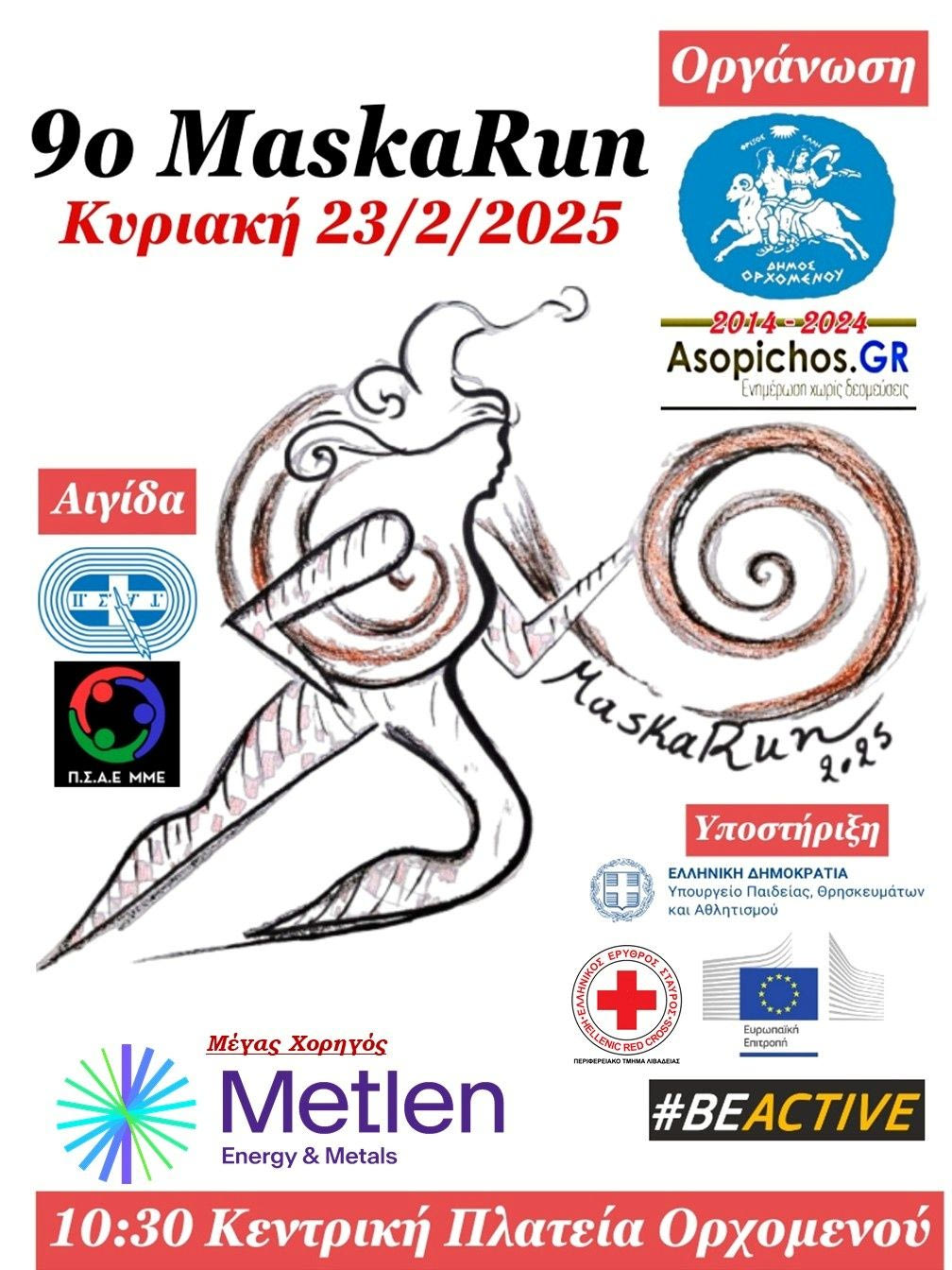 Ο Δήμος Ορχομενού και η ιστοσελίδα www.asopichos.gr, με την αιγίδα του Πανελληνίου Συνδέσμου Αθλητικού Τύπου (ΠΣΑΤ) και του Πανελληνίου Συλλόγου Αθλουμένων Εργαζομένων στα ΜΜΕ (ΠΣΑΕ-ΜΜΕ), την υποστήριξη του Ευρωπαϊκού Προγράμματος #BeActiveHellas του Υπουργείου Αθλητισμού διοργανώνουν το 9ο MaskaRun 2025 το οποίο θα διεξαχθεί στον Ορχομενό την Κυριακή 23 Φεβρουαρίου 2025 με εκκίνηση και τερματισμό την Πλατεία Ηρώων (κεντρική πλατεία).