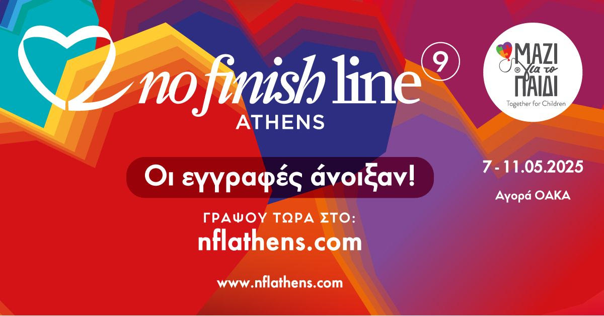 Ξεκίνησε η αντίστροφη μέτρηση για την έναρξη του 9ου No Finish Line Athens που θα πραγματοποιηθεί από την Τετάρτη 7 Μαΐου έως την Κυριακή 11 Μαΐου 2025 στην Αγορά του ΟΑΚΑ και οι ατομικές εγγραφές στον φιλανθρωπικό αγώνα «άνοιξαν» στο επίσημο site της διοργάνωσης nflathens.com.