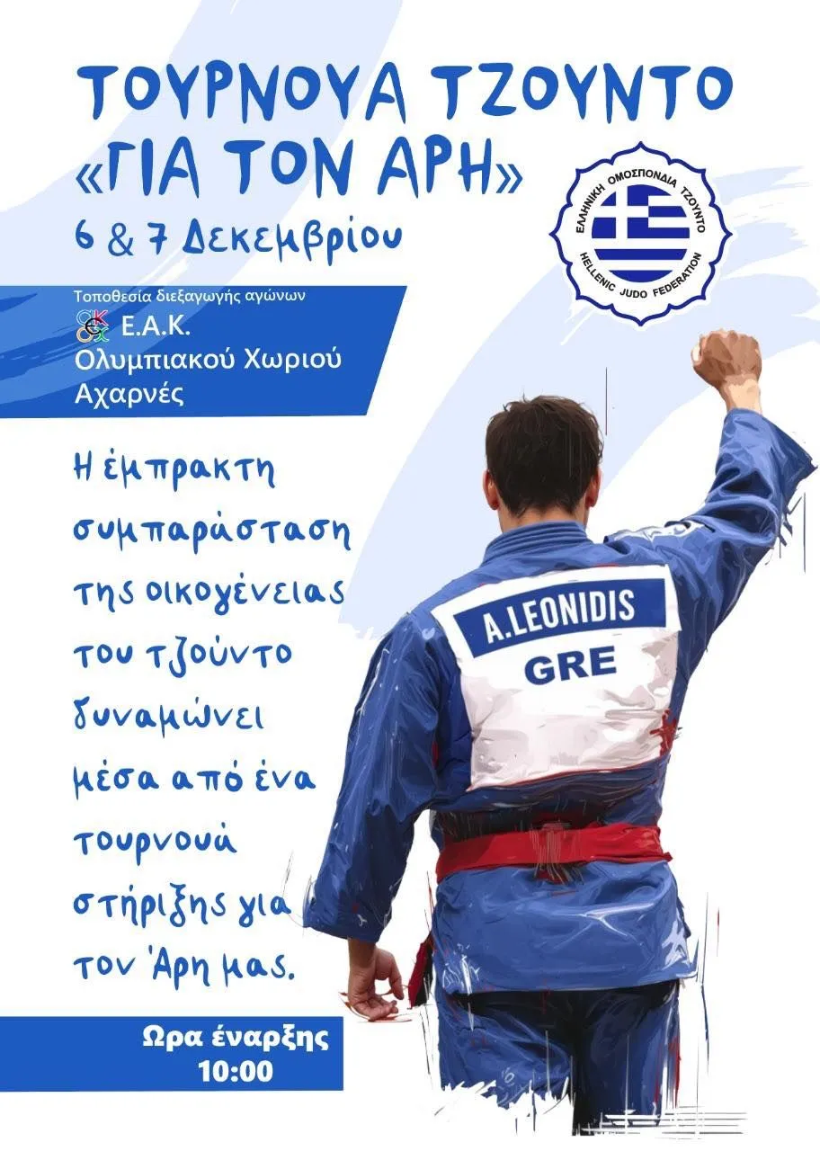 Το Σάββατο 6 και την Κυριακή 7 Δεκεμβρίου η Ελληνική Ομοσπονδία Τζούντo διοργανώνει ένα ξεχωριστό τουρνουά για όλες τις ηλικιακές κατηγορίες, με σκοπό την στήριξη και την αποκατάσταση του Άρη Λεωνίδη.