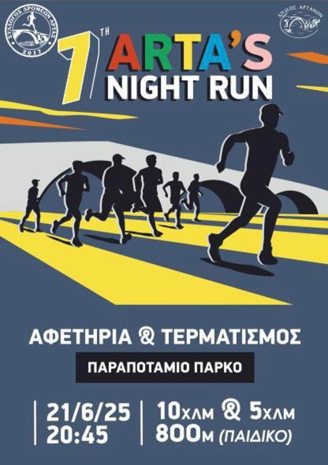 Στο πλαίσιο του εορτασμού της επετείου απελευθέρωσης της πόλης της Άρτας την 24η Ιουνίου 1881, ο Σύλλογος Δρομέων Άρτας και ο Δήµος Αρταίων, προκηρύσσουν τον 7ο Νυχτερινό Αγώνα Δρόμου «Arta Night Run 18 81».