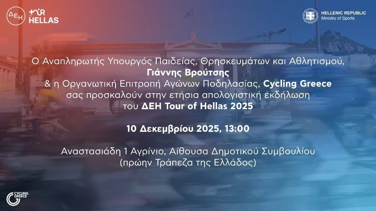 Η απολογιστική παρουσίαση του ΔΕΗ Tour of Hellas 2025 θα πραγματοποιηθεί παρουσία του Αναπληρωτή Υπουργού Αθλητισμού, Γιάννη Βρούτση, την Τετάρτη 10 Δεκεμβρίου 2025 και ώρα 13:00.