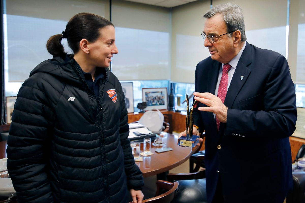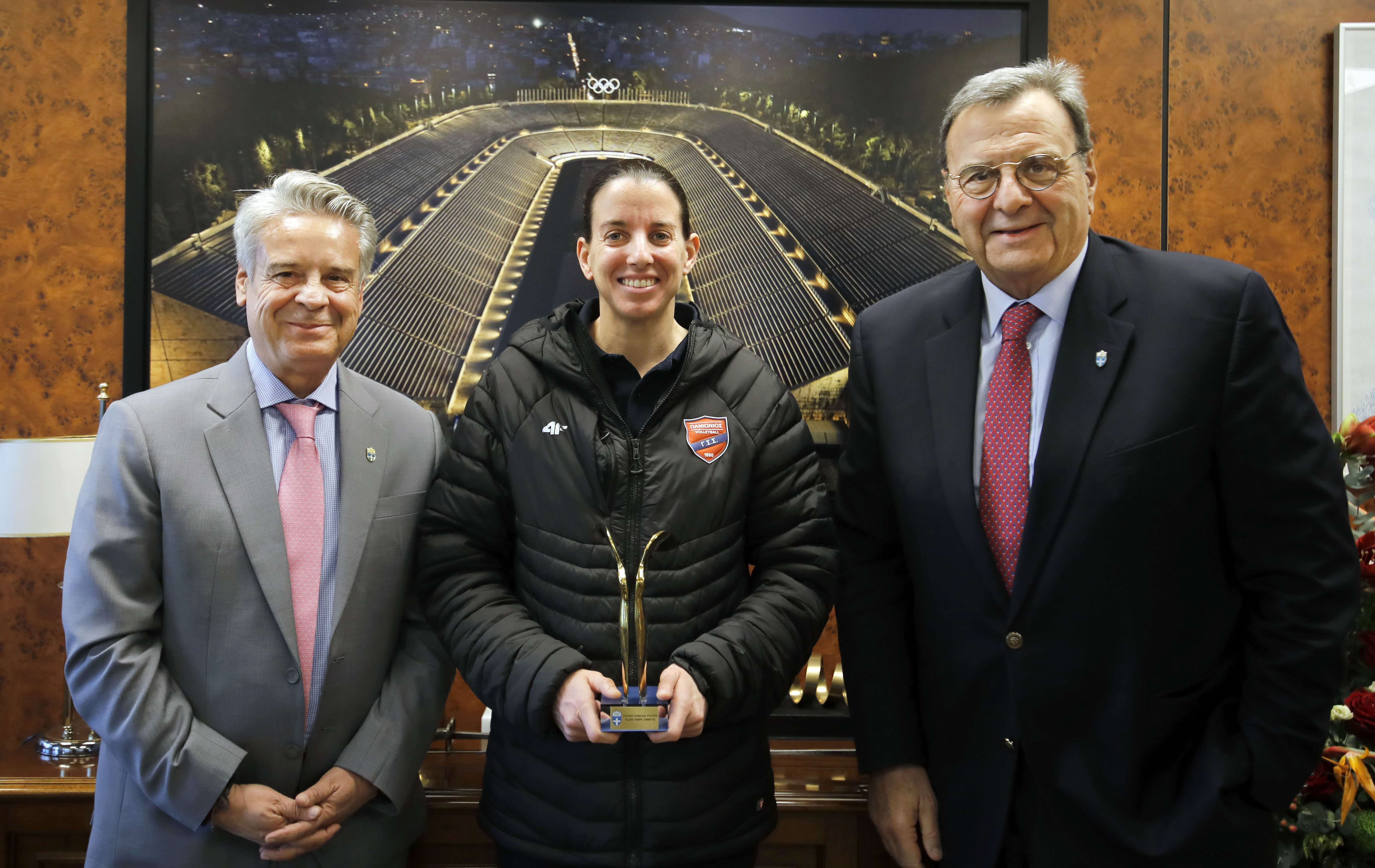 Στη συνέχεια ο Πρόεδρος της ΕΟΕ ανέλυσε στην αθλήτρια του βόλεϊ το πρόγραμμα «Υιοθετήστε έναν Αθλητή» που έχει δημιουργήσει η Ελληνική Ολυμπιακή Επιτροπή. «Στο πρόγραμμα θέλουμε να εντάξουμε 220 άτομα μέχρι τους Ολυμπιακούς Αγώνες του Λος Αντζελες, ασχέτως εάν τελικά προκριθούν. Από την 1η Ιανουαρίου ξεκίνησε το πρόγραμμα στήριξης στους πρώτους 74 αθλητές και αθλήτριες και θα φτάσουμε στους 220, δηλαδή στο σύνολο της Προολυμπιακής Ομάδας, ώστε όλοι τα μέλη της, να επικεντρωθούν απερίσπαστα στις προπονήσεις και την προετοιμασία τους. Έχει ιδιαίτερη σημασία να προκριθούν πολλοί αθλητές, γιατί η πρόκριση έχει την ίδια αξία με το να πάρεις μετάλλιο, λόγω της δυσκολίας της και των θυσιών που απαιτούνται».