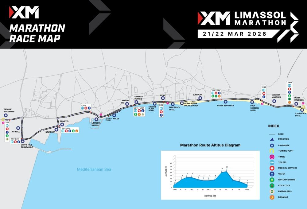 O ΟΠΑΠ Μαραθώνιος Λεμεσού 2026 θα διεξαχθεί στις 21-22 Μαρτίου 2026 με αγώνες 42 χλμ., 21 χλμ., 10 χλμ., 5 χλμ., 5 χλμ. εταιρικό και παιδική διαδρομή 1 χλμ.