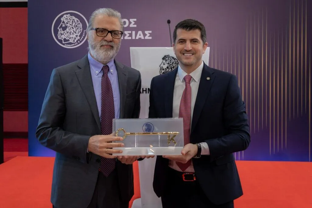 Στη συνέχεια ο Δήμαρχος Κηφισιάς, Βασίλης Ξυπολυτάς, ως δείγμα εκτίμησης και αναγνώρισης της πολύτιμης συμβολής του κ. Μυτιληναίου στην υλοποίηση του νέου Αθλητικού Κέντρου «Ο ΚΗΦΙΣΟΣ» τίμησε τον δωρητή του έργου παραδίδοντας στα χέρια του κ. Μυτιληναίου, μέσα σε θερμά χειροκροτήματα, το «χρυσό κλειδί της πόλης».
