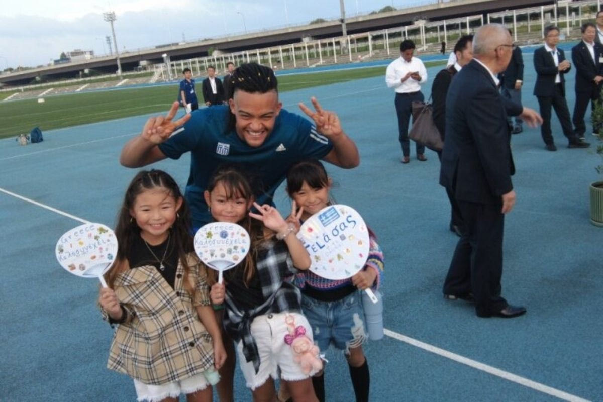 Τα μέλη της αποστολής στη συνέχεια έλαβαν αναμνηστικά δώρα και φωτογραφήθηκαν με τα παιδιά που βρέθηκαν στο στάδιο και κρατούσαν βεντάλιες με τα συνθήματα «Γεια σας» και «Καλή συνέχεια»