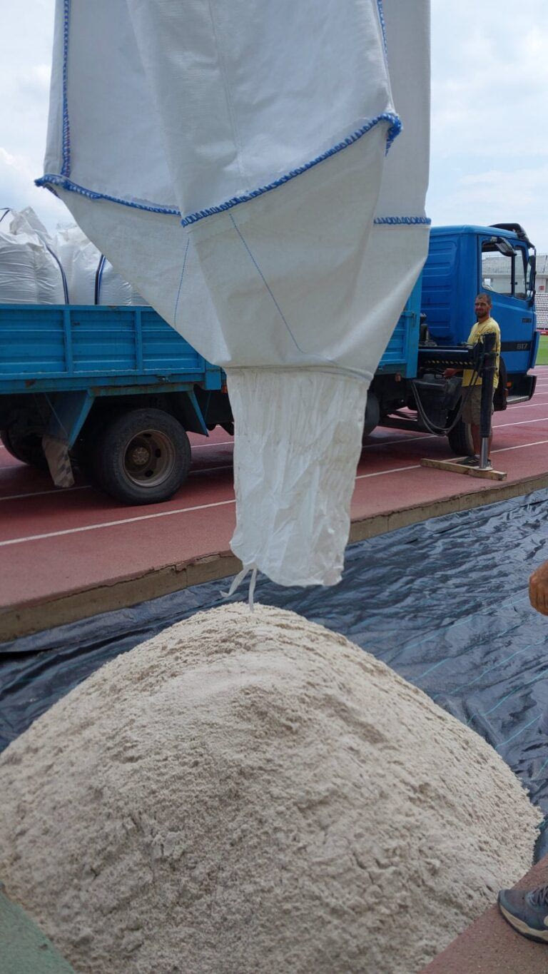 Η χαλαζιακή άμμος τοποθετήθηκε πάνω από ειδικό γεώπανο, το οποίο λειτουργεί αποστραγγιστικά και εξασφαλίζει ότι δεν θα γίνει ανάμειξη με το παλιό υπόστρωμα.