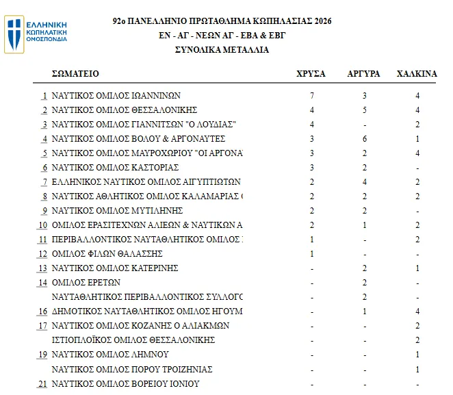 Ο Ναυτικός Όμιλος Ιωαννίνων κυριάρχησε στο Πανελλήνιο Πρωτάθλημα κωπηλασία που έγινε στο ανακαινισμένο Ολυμπιακό Κολυμβητήριο του Σχοινιά.