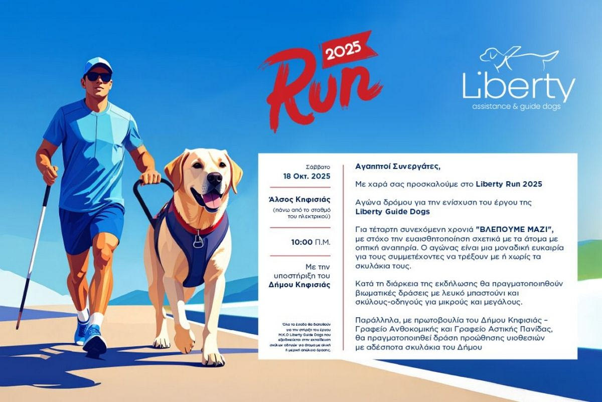 Το Liberty Run είναι ένας διαφορετικός αγώνας δρόμου για την ενίσχυση του έργου της Liberty Guide Dogs, που θα πραγματοποιηθεί το Σάββατο 18 Οκτωβρίου στο Άλσος Κηφισιάς.