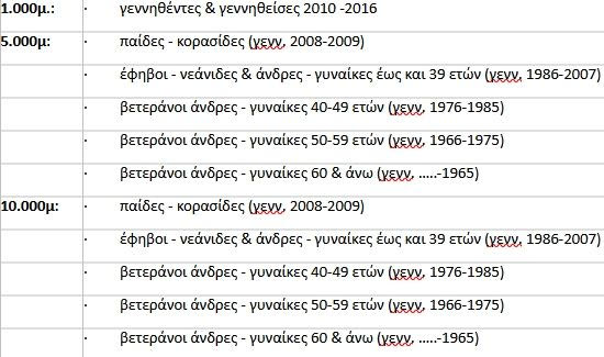 Θα διεξαχθούν αγώνες 1.000 – 5.000 και 10.000 μέτρων και μπορούν να συμμετέχουν αγόρια και κορίτσια Δημοτικών, Γυμνασίων και Λυκείων, ενήλικες (άνδρες και γυναίκες) καθώς επίσης και αθλητές και αθλήτριες Αθλητικών Σωματείων του Δήμου μας και άλλων Δήμων.