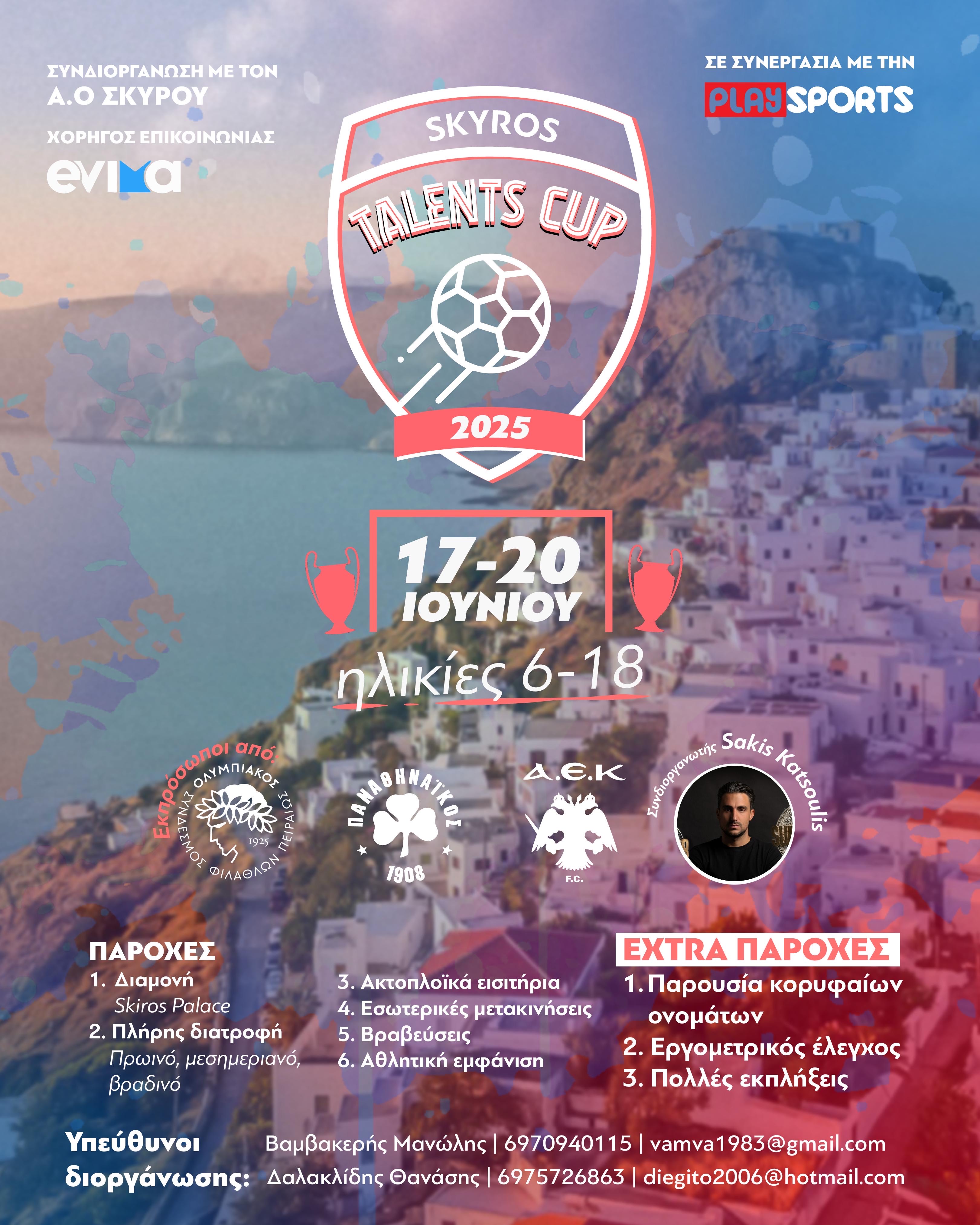 Το Skyros Talents Cup 2025 απευθύνεται σε παιδιά ηλικίας 6 έως 18 ετών, δίνοντάς τους την ευκαιρία να αγωνιστούν, να εξελιχθούν και να ζήσουν κάτι που θα θυμούνται για πάντα.