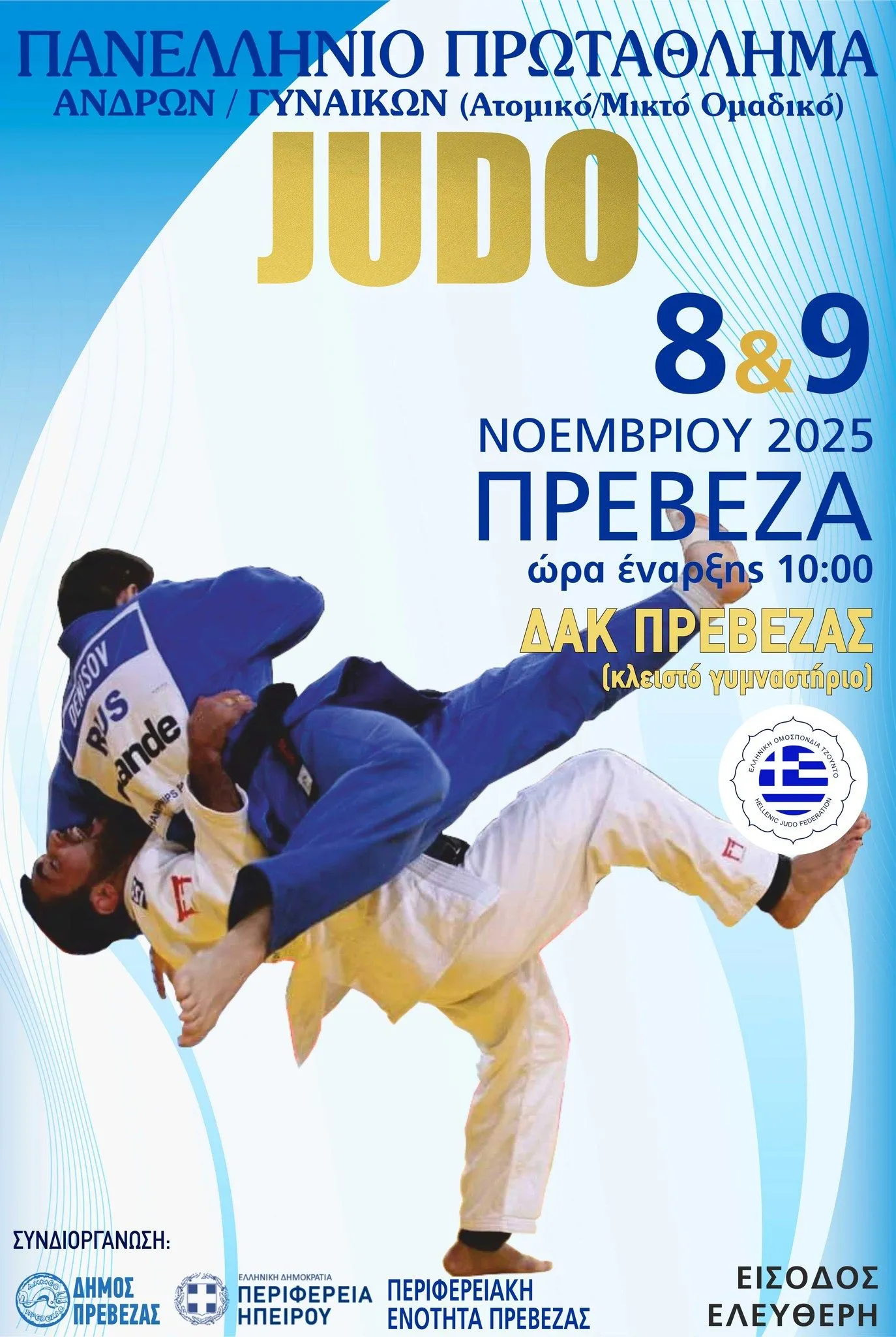 Στην Πρέβεζα το Σαββατοκύριακο 8-9 Νοεμβρίου θα διεξαχθεί το Πανελλήνιο Πρωτάθλημα τζούντο ανδρών και γυναικών.