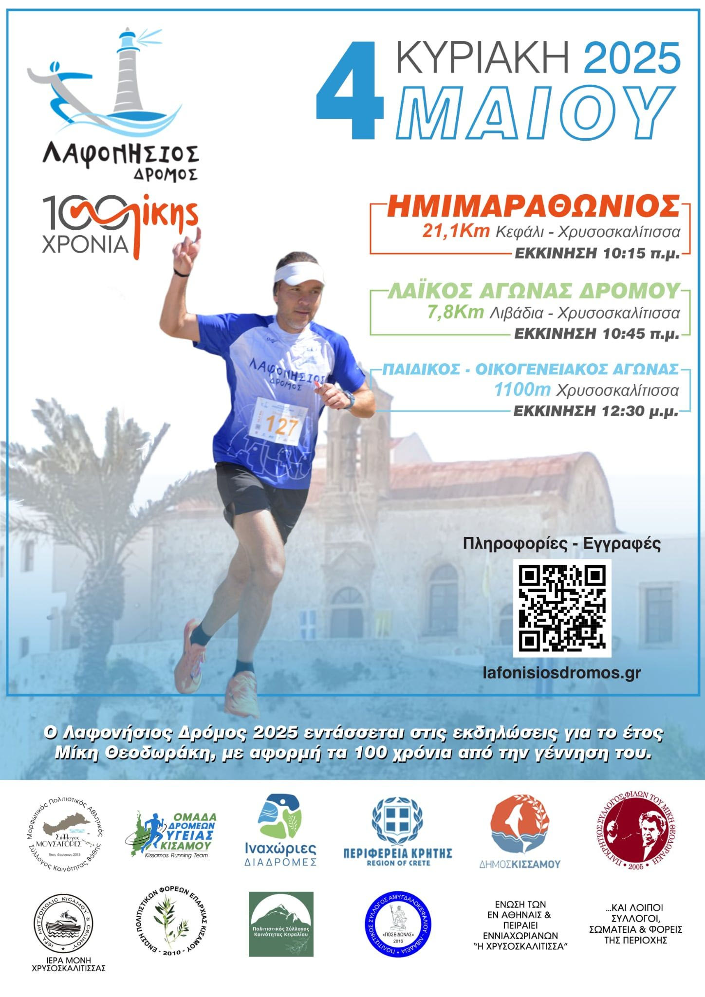 Ο Μορφωτικός, Πολιτιστικός και Αθλητικός Σύλλογος της κοινότητας Βάθης “ΜΟΥΣΑΓΟΡΕΣ” με έδρα τα Πλοκαμιανά Κισσάμου, Χανίων, σε συνεργασία με την Περιφερειακή Ενότητα Χανίων της Περιφέρειας Κρήτης, τον Δήμο Κισσάμου, τον Σύλλογο Φίλων Κρήτης “Μίκης Θεοδωράκης” και τις “Ιναχώριες Διαδρομές”, που εκπροσωπούνται από τους πολιτιστικούς συλλόγους της περιοχής, διοργανώνουν τον ιστορικό αγώνα ΛΑΦΟΝΗΣΙΟΣ ΔΡΟΜΟΣ 2025, την Κυριακή 4 Μαϊου, προς τιμήν των 100 χρόνων από τη γέννηση του Μίκη Θεοδωράκη.