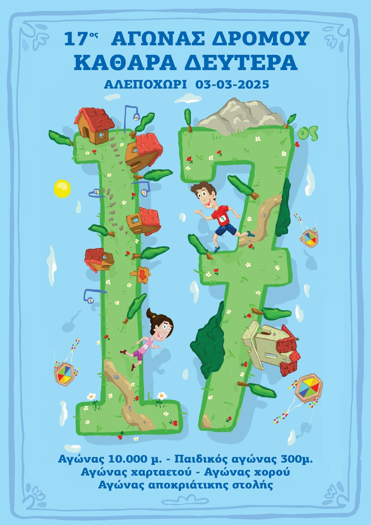 Την Καθαρά Δευτέρα 3 Μαρτίου 2025 θα πραγματοποιηθεί στο Αλεποχώρι Αττικής ο 17ος Αγώνας Δρόμου Καθαράς Δευτέρας με 10 χλμ. και 300μ. για παιδιά.