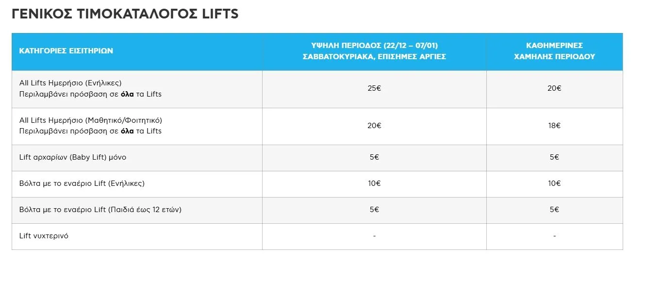 - Μετά την έκδοση του εισιτηρίου ουδεμία έκπτωση παρέχεται, ή επιστροφή χρημάτων, ανεξαρτήτως καιρικών συνθηκών και λειτουργίας αναβατήρων.